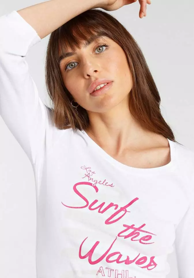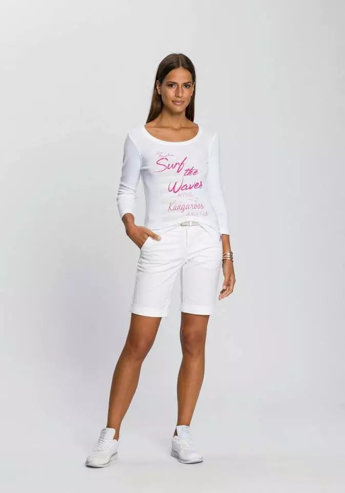 Genau auf deiner Wellenlänge: Das Shirt von Kangaroos ist mit seinem Druck in Vintage-Optik auf der Vorderseite sowie den farblich abgestimmten Streifen entlang der Seitennaht ein cooler Freizeitbegleiter. Ein weiter Rundhalsausschnitt und modische 3/4-Ärmel ergänzen den entspannten Look des Longsleeves, das in sportlicher Rippoptik aus angenehmer Baumwollqualität überzeugt. Mit Jeans oder Caprihosen, dazu Turnschuhe oder Sneaker, ist der Casual-Style komplett. Nicht nur für Surfer-Girls: das Shirt von Kangaroos hat die perfekte Welle raus.