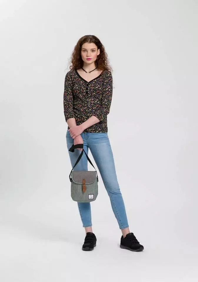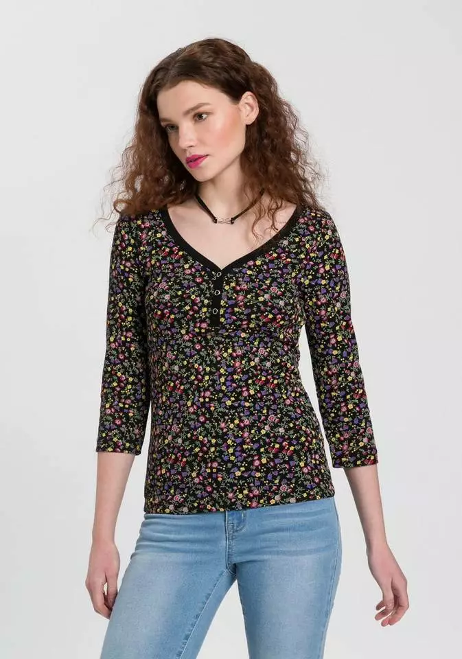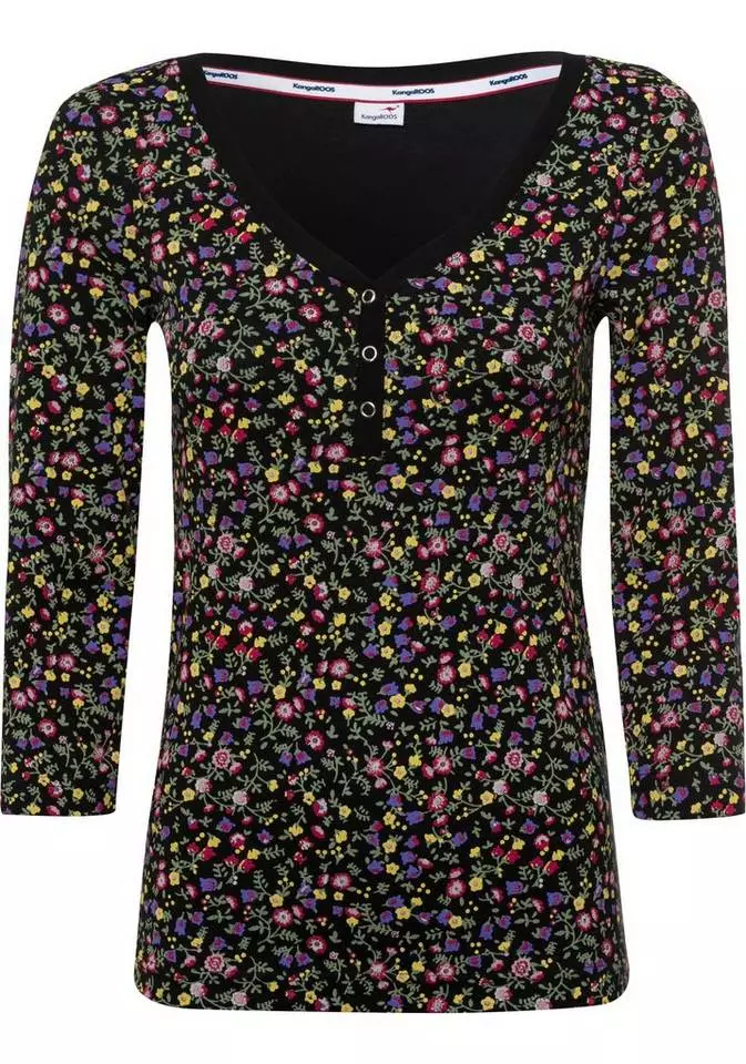 Neue Outfits lassen sich mit dem 3/4-Arm-Shirt von KangaROOS ganz leicht kombinieren. Denn das Shirt im Blumen-Design bringt eine romantische und verspielte Note in jedes noch so schlichte Outfit. Dieses Shirt hat einen V-Ausschnitt und ist hüftbedeckend sowie sehr figurbetont geschnitten3/4-Arm-Shirt, sodass deine Silhouette schön betont wird.