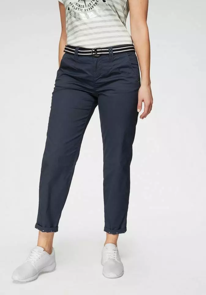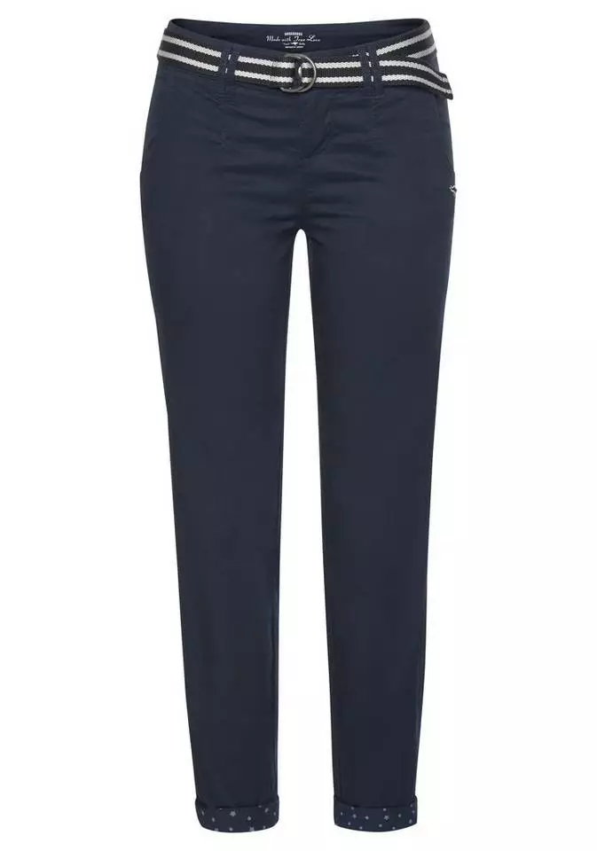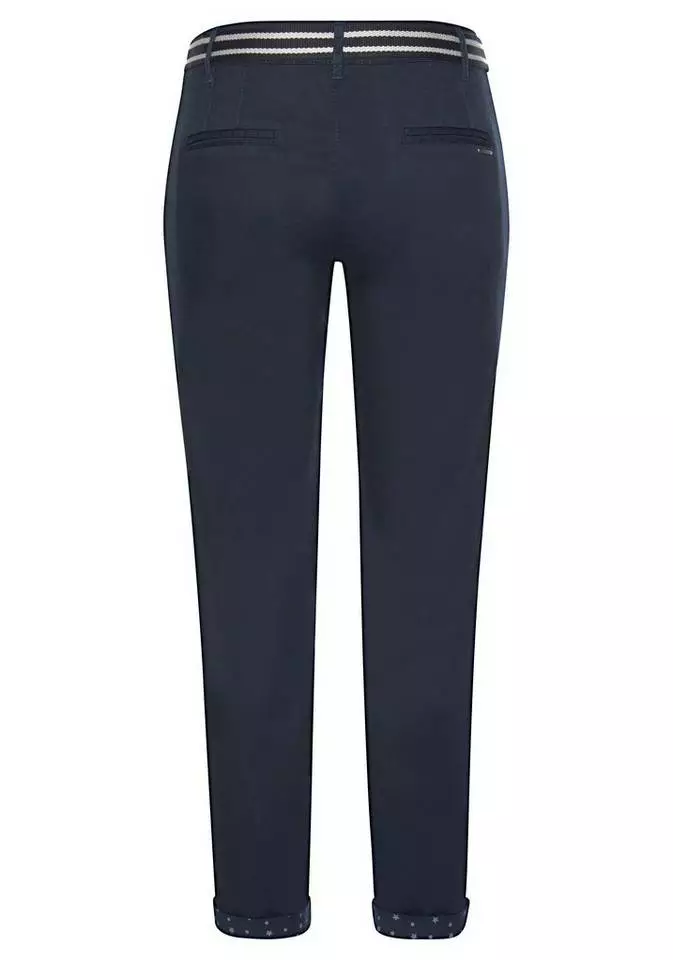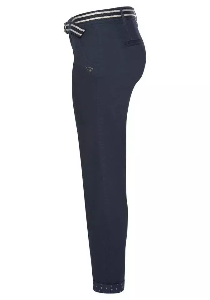 Detailverliebte Looks sind ganz nach deinem Geschmack? Dann sind es die Chinos von Kangaroos garantiert auch. Der klassische Tapered-fit zeigt sich in modischer 7/8-Länge. Wer es gerne noch kürzer mag, lässt einfach die gemusterten Krempelsäume blitzen. Seitliche Eingriff- und Paspeltaschen an der Rückseite punkten als funktionale Extras der Hose. Der gestreifte Webgürtel setzt einen lässigen Akzent. Das seitliche Logo bringt dezent die Marke ins Spiel und rundet die aus elastischem Twill gefertigte Hose gelungen ab. Mehr als ein Shirt und Sneaker brauchst du nicht, um mit den Chinos von Kangaroos entspannt unterwegs zu sein.
