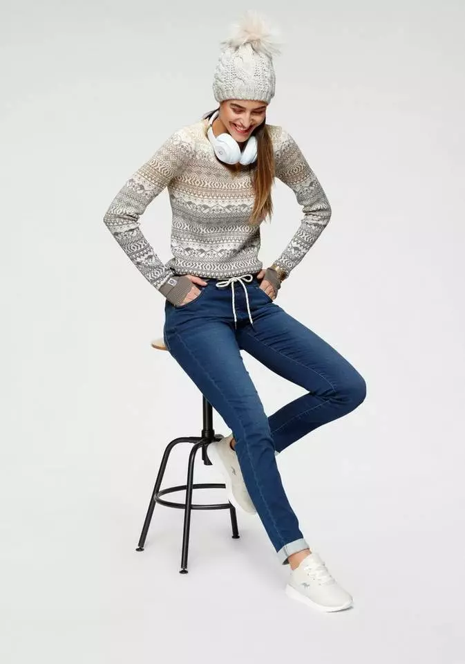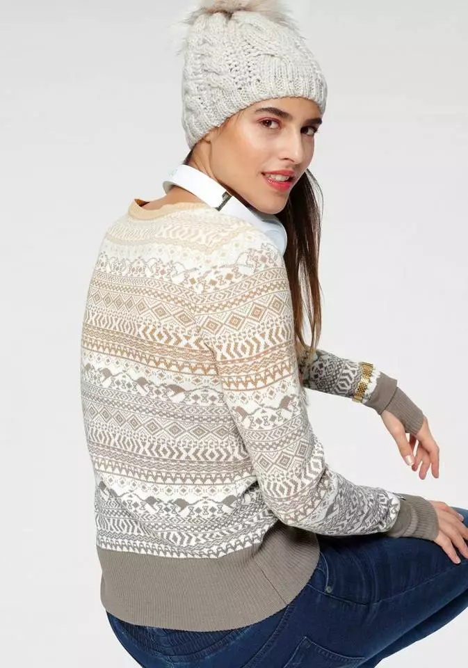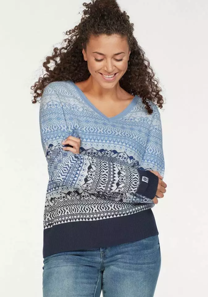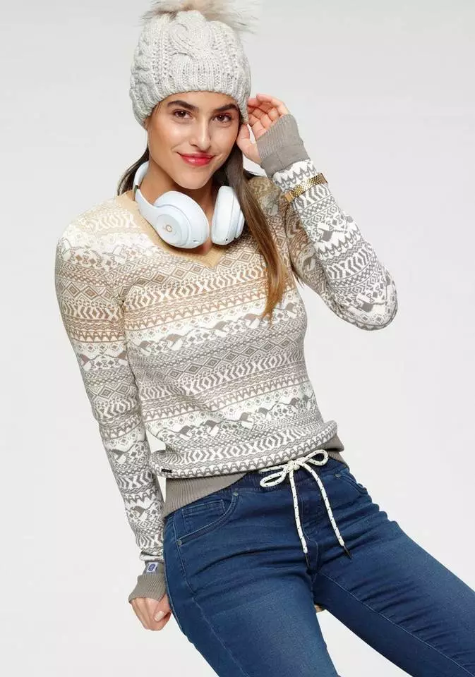 Einfach gemütlich! Der Norwegerpullover von Kangaroos bringt mit seinem traditionellen Strickmuster sportiven Charme in deinen Kleiderschrank. Besonders angesagt: Das feine Norwegermuster wird mit einem Farbverlauf unterlegt, der sich Ton in Ton vom V-Ausschnitt bis zum Saum verdunkelt. Die Rippstrickbündchen des Pullis sind dabei effektvoll in Unifarben abgesetzt, während die feste Strickqualität des figurbetonten Basics dich angenehm wärmend umhüllt. Tipp: Mit einem passenden Rock, Strumpfhosen und Stiefeletten hast du einen trendigen Style für den Norwegerpullover von Kangaroos gefunden.