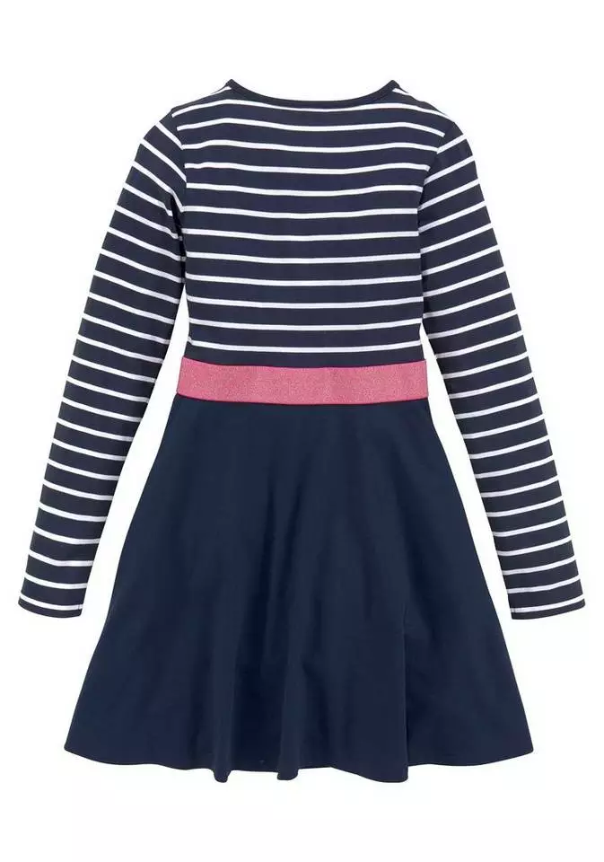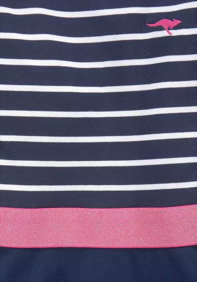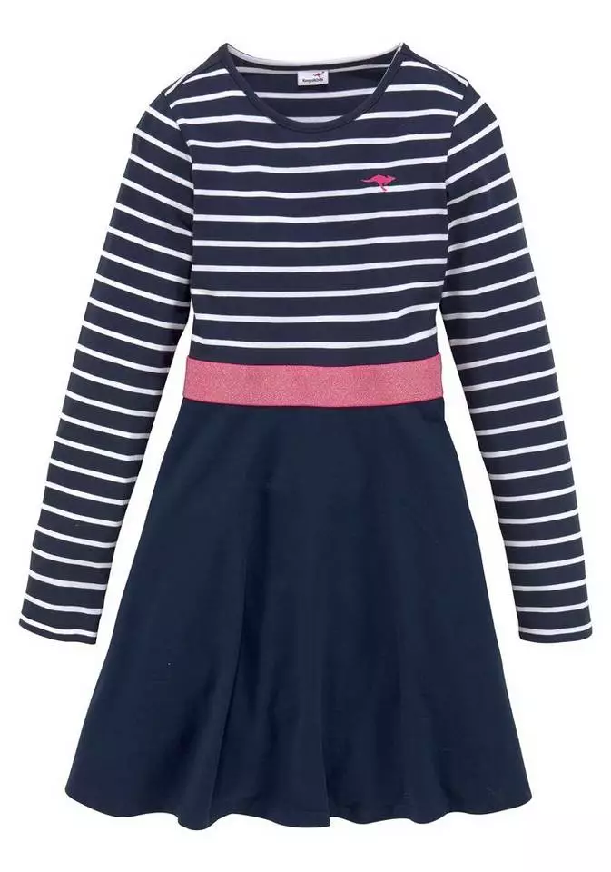 Dieses sportliche Skaterkleid von Kangaroos für Mädchen erhält Glamour durch die breite, elastische Glitzerbordüre auf Taillenhöhe. Für eine maritime Optik sorgt das Oberteil im Ringel-Look mit entspanntem Rundhalsausschnitt, langen Ärmeln und kontrastfarbiger Logostickerei vorn. Der lässig ausgestellte Rockteil erscheint in monochromem Design. Komfortable Trageeigenschaften garantiert dem Jerseykleid seine weiche, bewegungsfreundliche Stretchqualität. Beste Stylingpartner sind weiße Tennisschuhe. Superhübsch und sehr bequem – das coole Skaterkleid von Kangaroos für Mädchen!