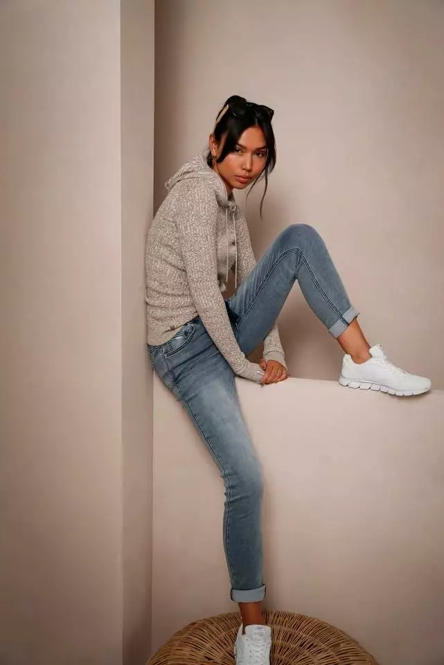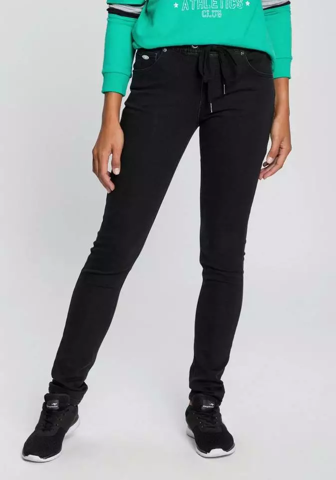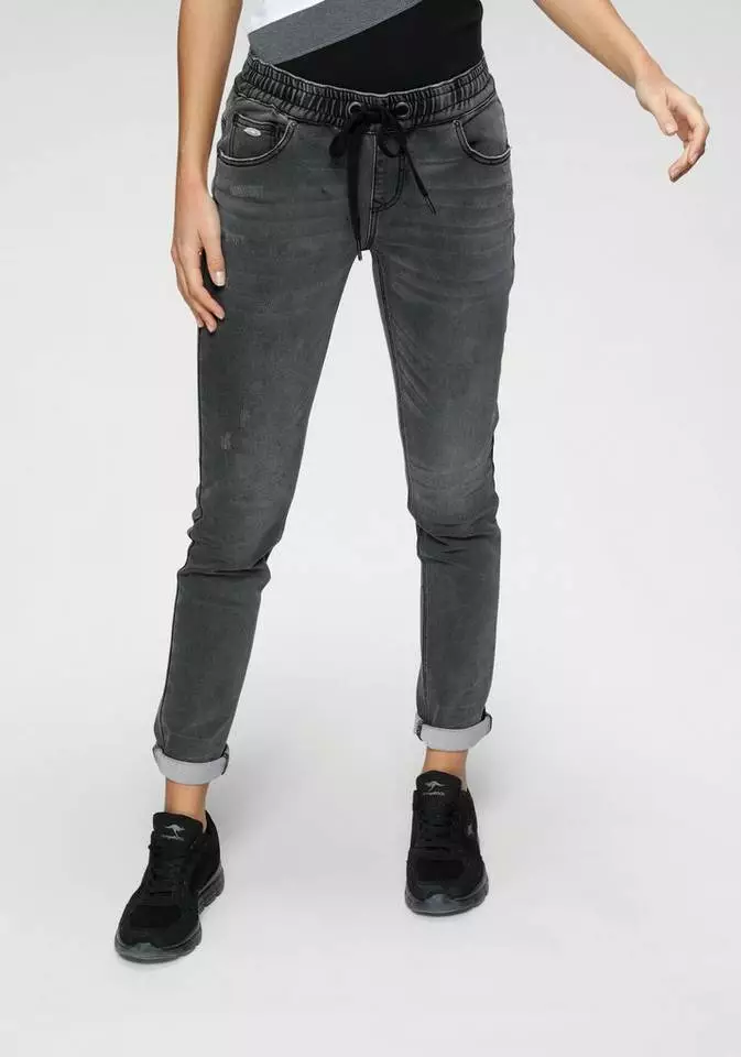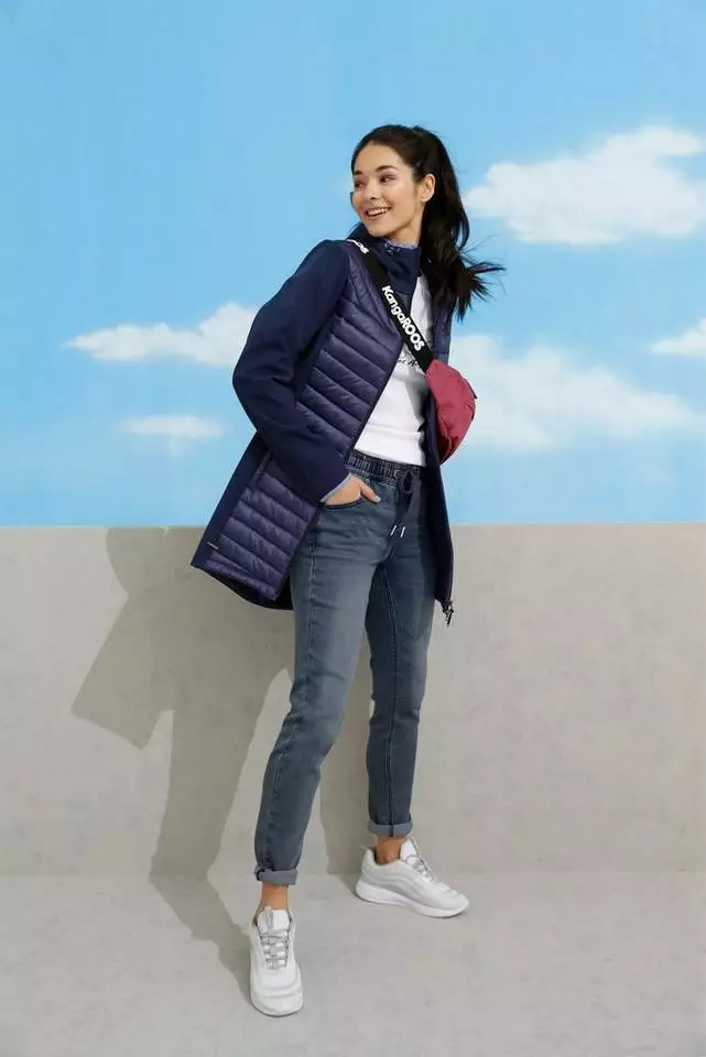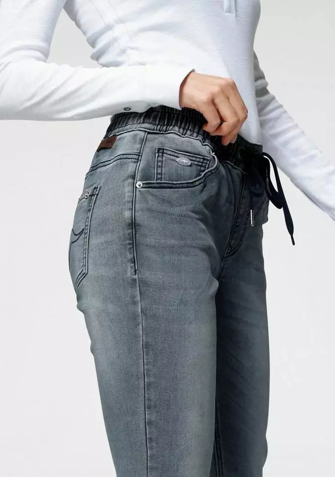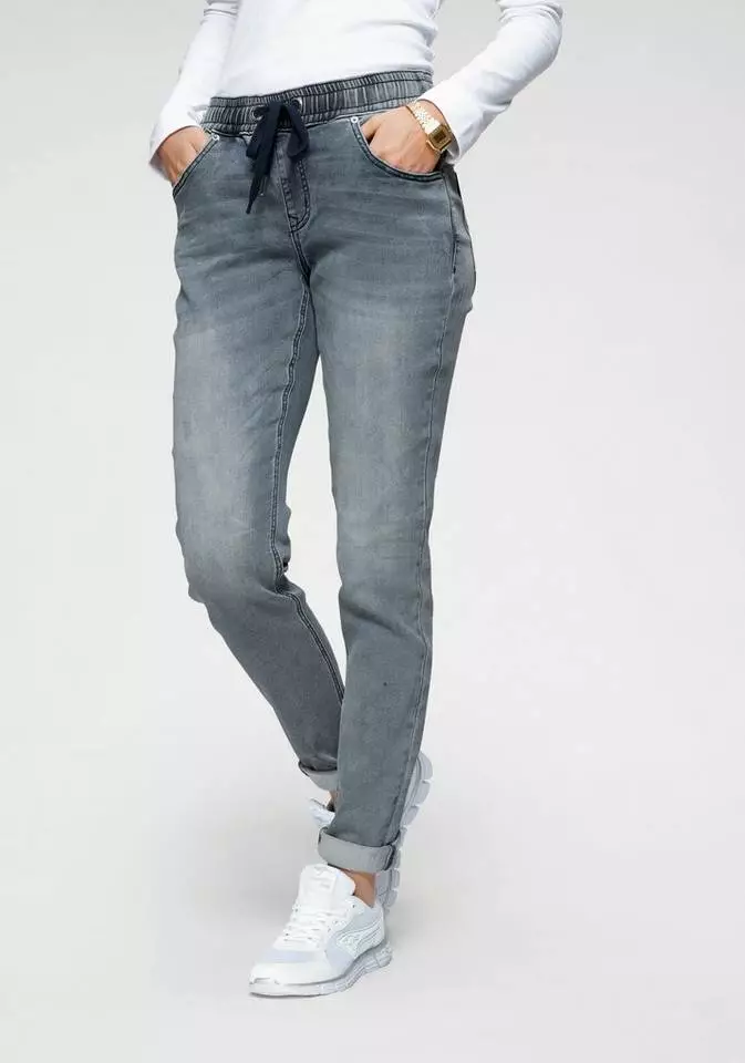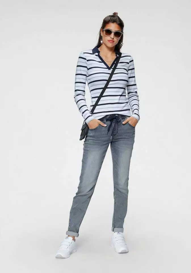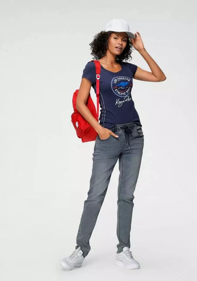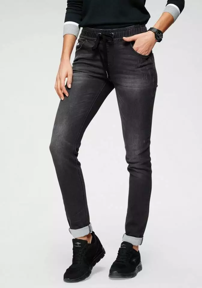 Take it easy – so lautet die Devise dieser entspannten Jeans im Jogging-Stil von Kangaroos! Clean oder mit Coolen Destroyed-Details und eine leichte Used-Waschung machen den lässigen Look der Denim aus, die sich mit normaler Leibhöhe und in Straight-fit-Passform präsentiert. Das dehnbare Bündchen mit Kordelzug sorgt nicht nur für den perfekten Sitz, sondern macht die Damenjeans auch so bequem wie eine Jogginghose. Der ideale Begleiter für relaxte Freizeitaktivitäten also! Dazu am besten Sneakers und den Lieblingskuschelpulli kombinieren. Ein Trendteil zum Wohlfühlen: die Joging-Jeans von Kangaroos!