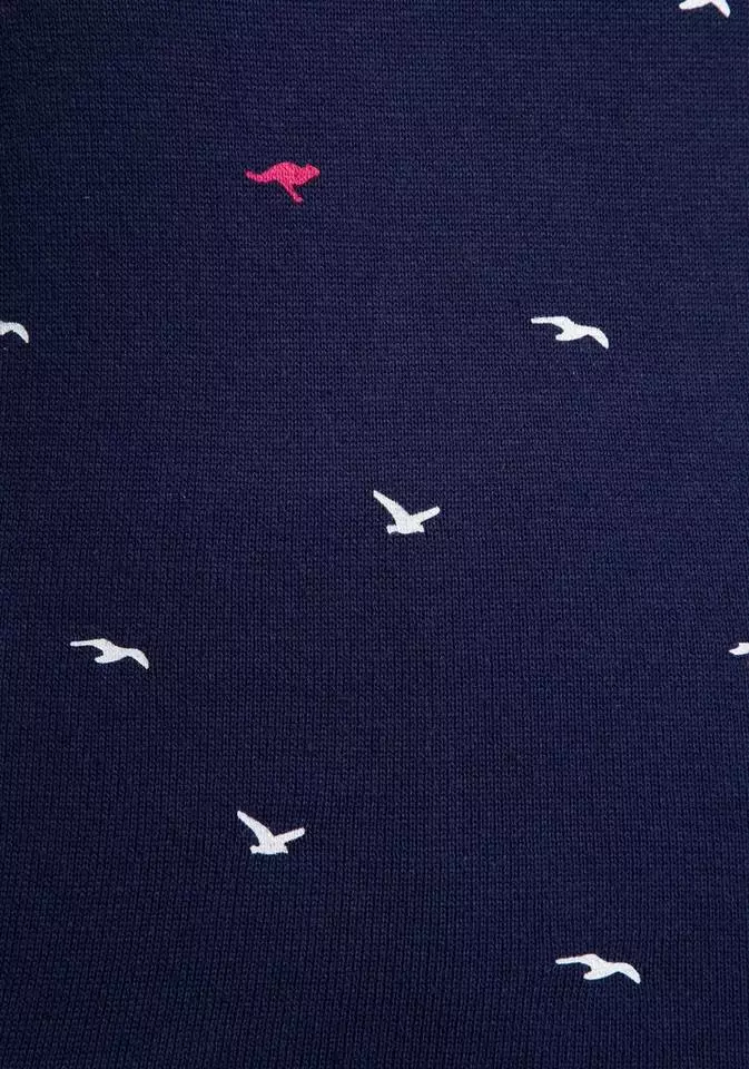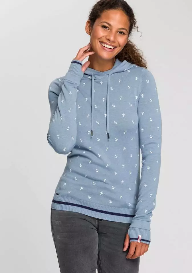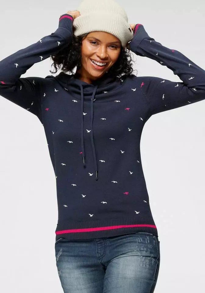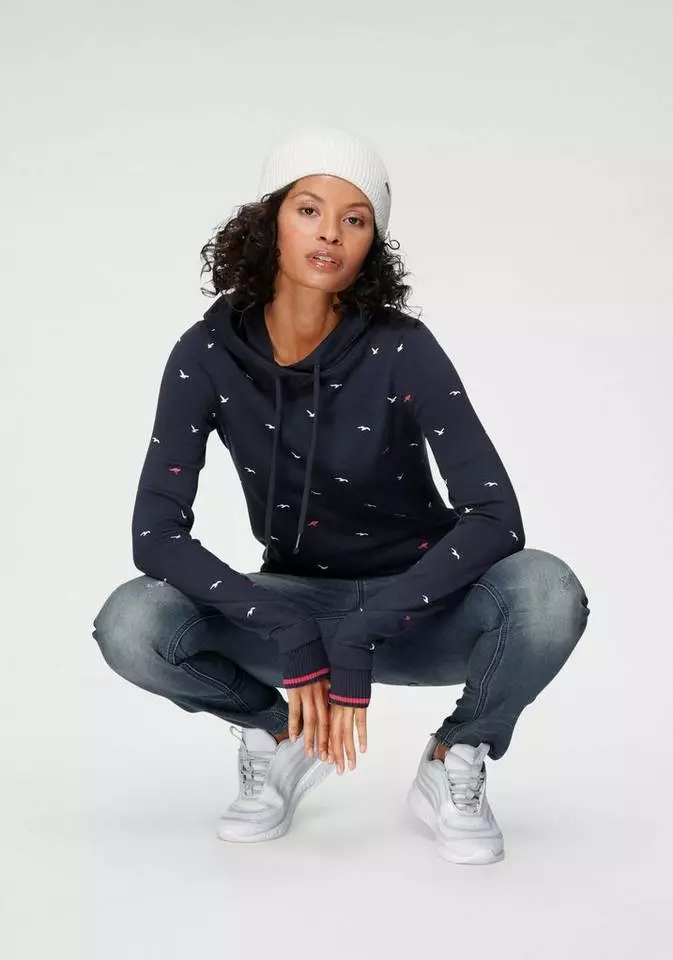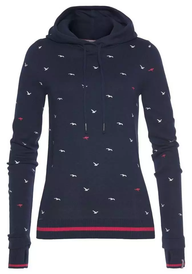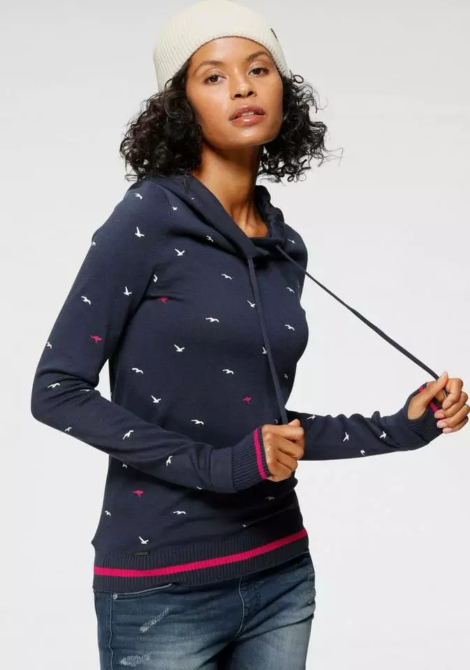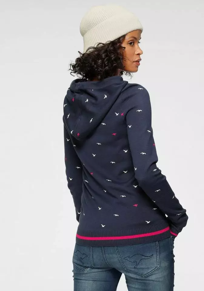 Du liebst sportlich coole Styles? Dann ist der Hoodie von Kangaroos bestimmt was für dich. Der Kapuzenpullover ist aus einer feinen Strickqualität gefertigt und bringt einen erfrischenden Alloverprint, durchsetzt von kleinen Logo-Details mit. Während die Kapuze über einen Tunnelzug in der Weite zurecht gezogen werden kann, haben dir die geringelten Rippbündchen der Ärmel praktische Daumenlöcher zu bieten. Der Pullover ist ein Oberteil für viele Looks, passt aber auch super mit dem passend gemusterten Jerseyrock zusammen. Einfach cool – der Hoodie von Kangaroos.