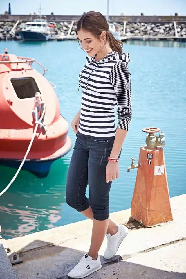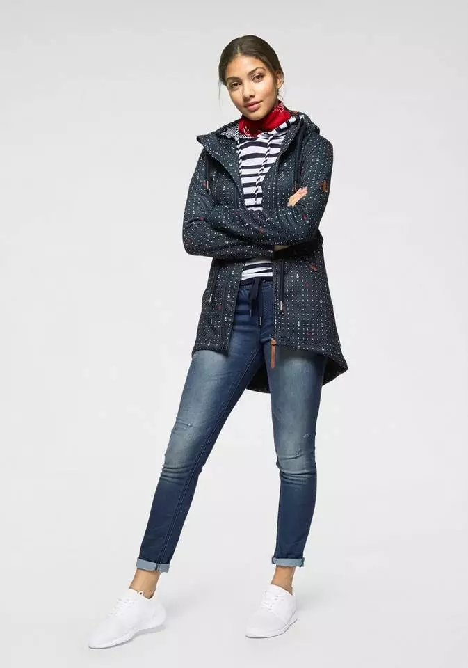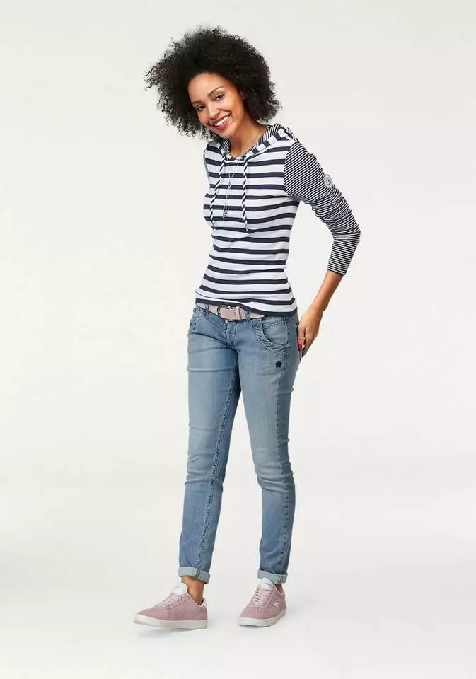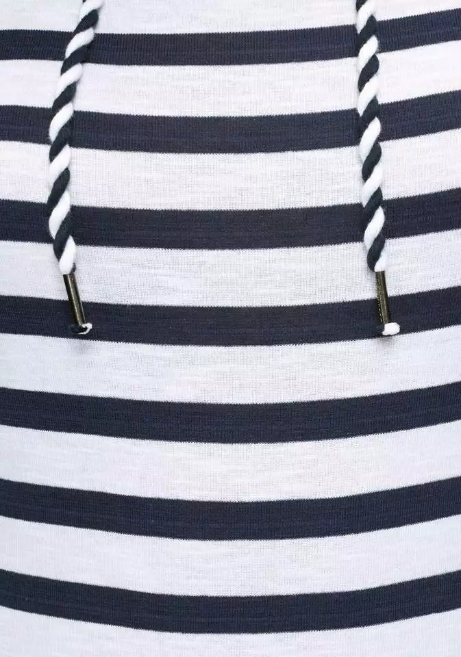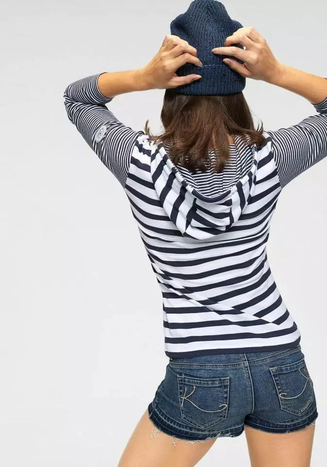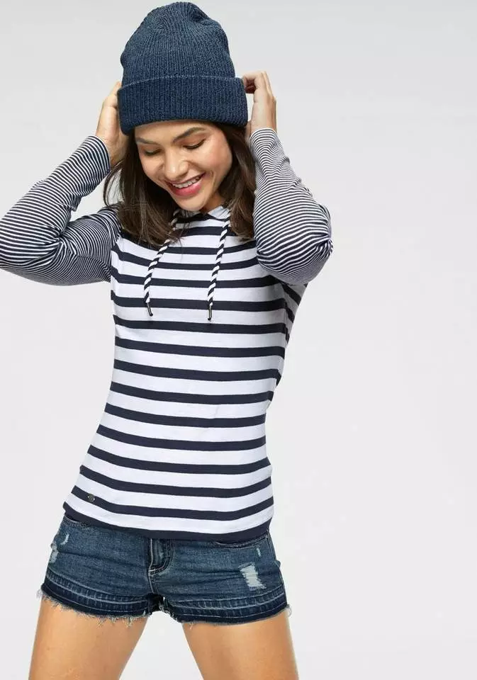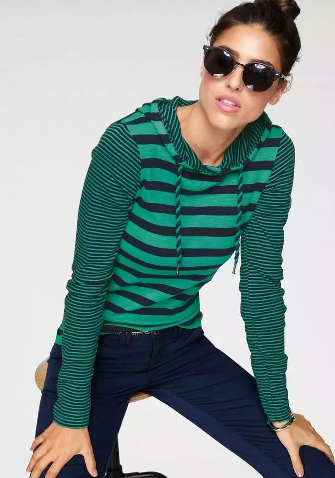 Zwei unterschiedliche Streifenmuster lassen das Kapuzenshirt von Kangaroos sportlich und cool zugleich wirken. Unterstrichen wird dieser Look durch die zweifarbige Kordel mit den kleinen Metallabschlüssen, die durch die Kapuze des Shirts gezogen wurde. Eine kleine Labelplakette über dem Saum und ein Patch auf dem Ärmel runden den modischen Style des Langarmshirts gekonnt ab. Besonders schön passt das Longsleeve aus einer soften Jerseyqualität zu Jeans und Sneakern. Aber auch zu einem Rock und Ballerinas sieht der leichte Hoodie einfach super aus. Für alle, die bequeme Mode lieben ist das gestreifte Kapuzenshirt von Kangaroos genau das Richtige!