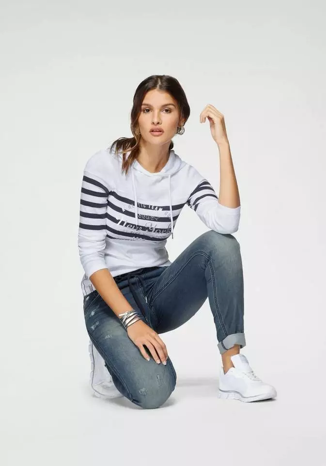Das Langarmshirt von Kangaroos hebt den Athleisure-Trend auf ein neues Level. Natürlich bringt es eine coole Tunnelzugkapuze mit. Darüber hinaus glänzt das Shirt aber wortwörtlich durch seinen vorderseitig aufgebrachten Metallic-Print. Dieser ist von garngefärbten Blockstreifen umgeben. Entlang der Seitennähte sind bei dem Baumwollpullover noch dekorative Kontrastnähte zu entdecken. Leggings gelten hier als genauso coole Styling-Partner wie Jeans oder Jogpants. Garantiert ständig im Einsatz – das Langarmshirt von Kangaroos.