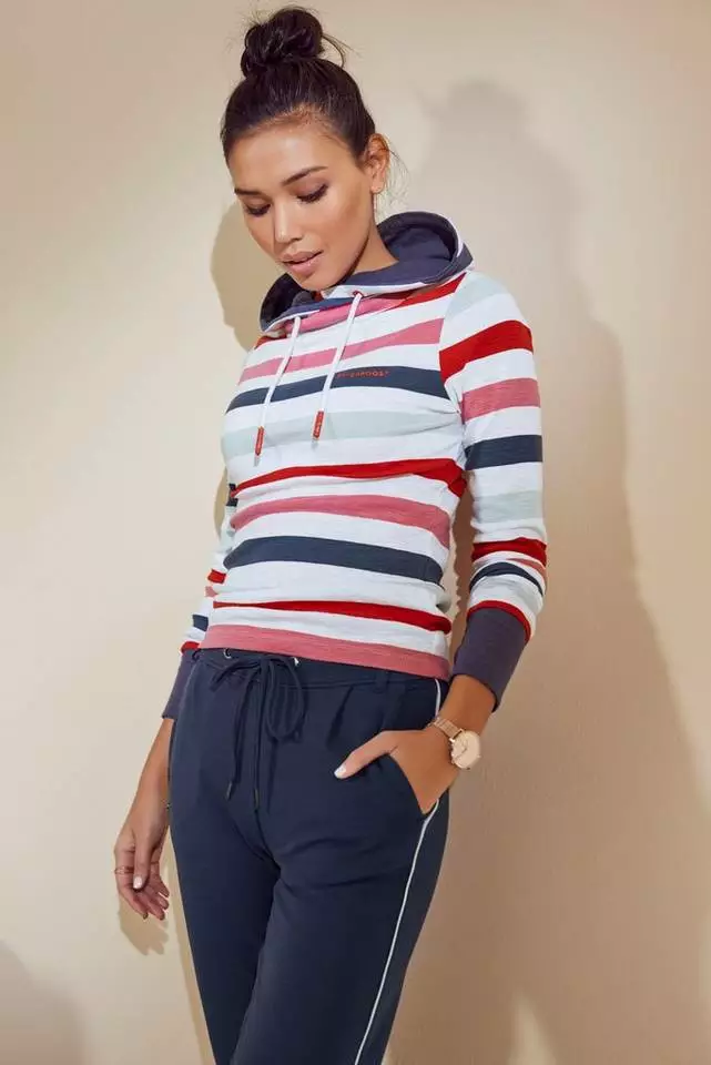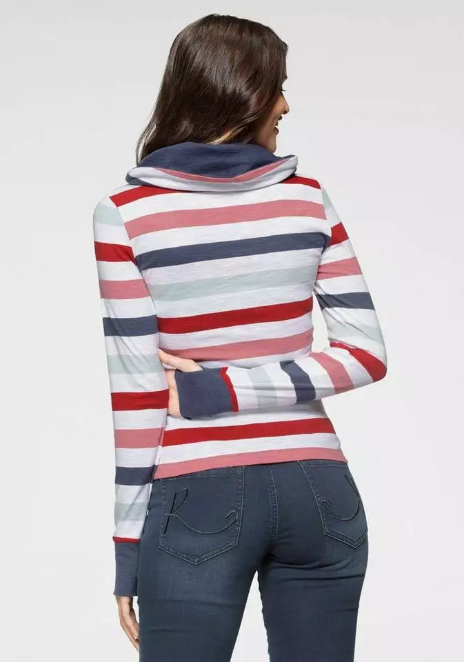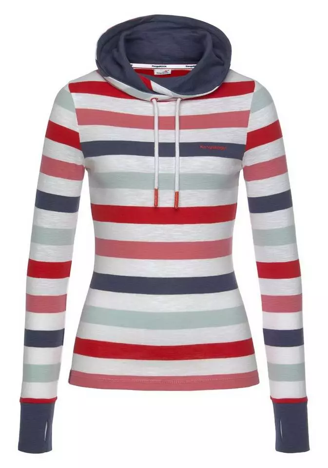 Gemütlich geht es mit dem Streifenshirt von Kangaroos zu. Das sieht man dem Pullover auf Anhieb an. In dieses Oberteil mit gefüttertem Kragen möchte man sich einfach sofort einkuscheln. Vor allem, weil sich die Ärmelbündchen durch die Daumenlöcher ganz bequem fast über die Fingerspitzen hinaus tragen lassen. Während das Streifenmuster garngefärbt ist, schließt der weiche Sweater noch mit einem kleinen Markenschriftzug ab. Den trägst du am besten über Jeans. Oder zu Leggings und wärmenden Fell-Boots! Bequem unterwegs sein bedeutet, das Streifenshirt von Kangaroos zu tragen.