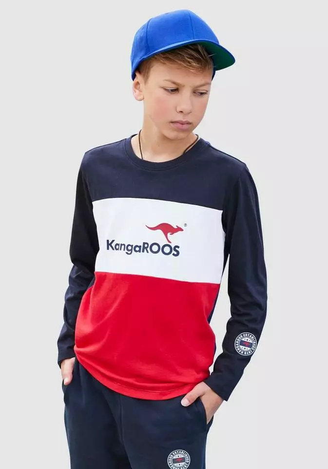 Besorge deinem Sohn ein Design der Extraklasse: Das entspannte Langarmshirt von Kangaroos für Jungen darf in der Casual-Garderobe deines Sohnes nicht fehlen! Das Longsleeve fügt sich mit dem klassischen Rundhalsausschnitt und der langärmligen Form perfekt in die Garderobe deines Sohnes ein. Das moderne Colorblocking-Design im Blockstreifen-Style macht das Basic dabei zu seinem Lieblingsstück. Besonders der Labelschriftzug auf der Brust und der markentypische Aufdruck am Ärmel machen das Oberteil zum Blickfang. Dank der weichen Haptik verwöhnt das Jerseyshirt deinen Junior mit einem tollen Tragegefühl, der bequem gerade Schnitt garantiert zudem einen optimalen Sitz bei jeder Bewegung. Kombiniere dieses Teil am besten unkompliziert mit Baggyjeans und Sneakers! Mithilfe des Langarmshirts von Kangaroos für Jungen entstehen im Handumdrehen tolle Looks!