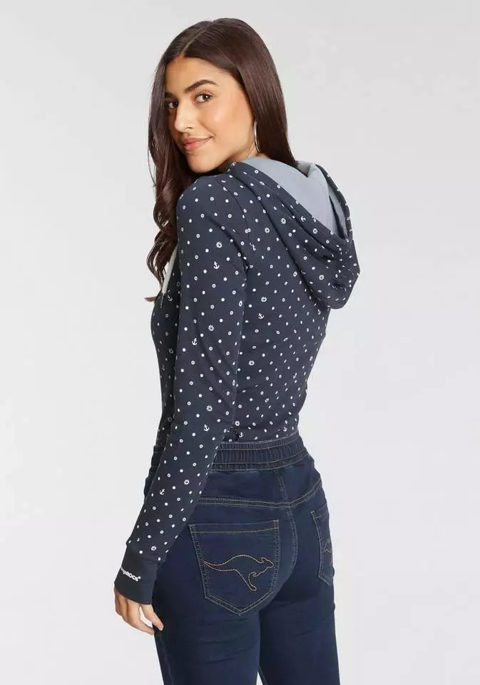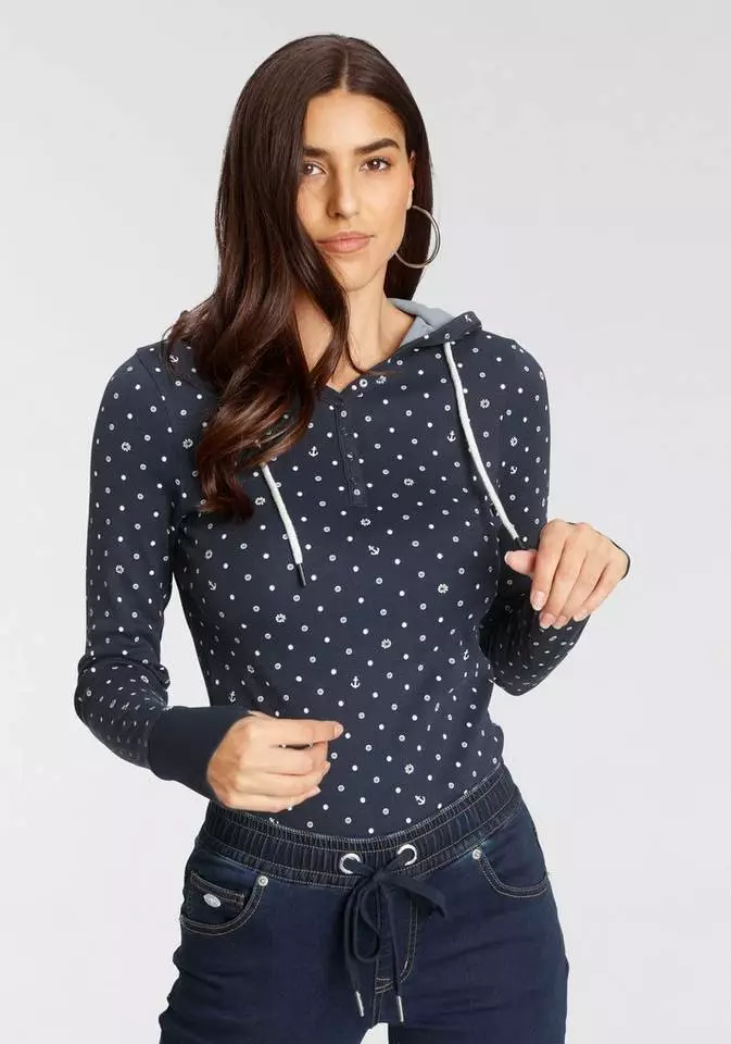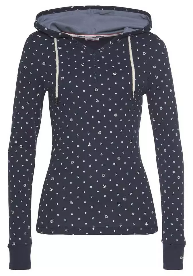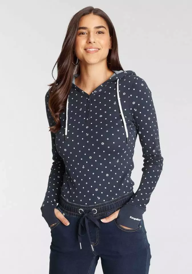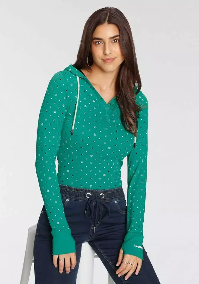 Schau dir das Langarmshirt von KangaROOS mal genauer an. Dieses Langarmshirt hat eine angesetzte Kapuze – sie lässt sich mit einem Kordelzug in der Weite verstellen. Die langen Ärmel haben Daumenlöcher, die gleichzeitig den guten Sitz bieten und deine Handgelenke warm halten. Dieses Shirt ist hüftlang sowie sehr figurbetont geschnitten, sodass es deine Figur auf schöne Weise betont.