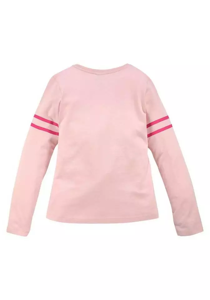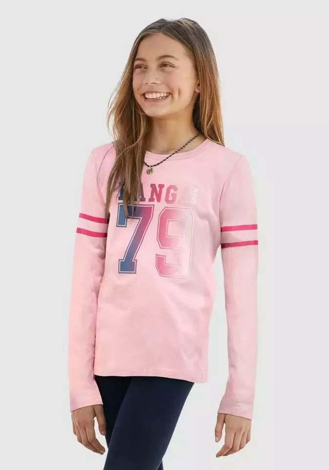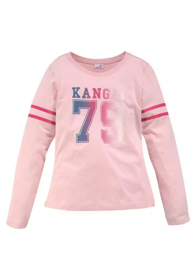 Mit einem zarten Farbverlauf im großen Logodruck vorn besticht das Langarmshirt von Kangaroos für Mädchen. Die beiden schmalen Kontraststreifen an seinen Ärmeln und ein weiterer Markendruck hinten unterstreichen seine sportliche Optik. Bequem ist die dezent antaillierte Basicform mit entspanntem Rundhalsausschnitt und lässig ausgestelltem Saum. Zugleich ist das Shirt durch seine weiche Jerseyqualität einfach toll. Jeansrock oder Stretchdenim sind im Team mit Sneakers die erste Wahl dazu. Für trendige Athleisure-Looks ein toller Griff – das modische Langarmshirt von Kangaroos für Mädchen!