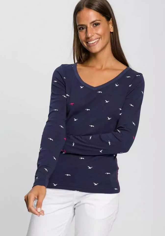 Mit dem Langarmshirt von KangaROOS stellst du im Handumdrehen ein neues Outfit zusammen. Durch den Aufdruck wirkt es lässig und peppig. Dieses Shirt hat einen V-Ausschnitt und ist hüftbedeckend sowie sehr figurbetont geschnittenLangarmshirt, sodass deine Silhouette schön betont wird.