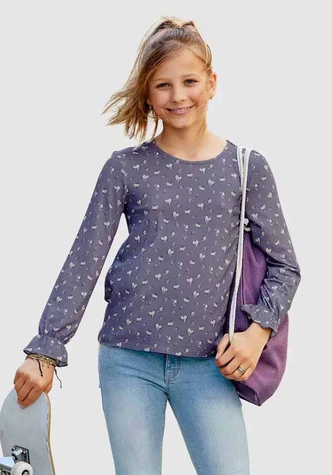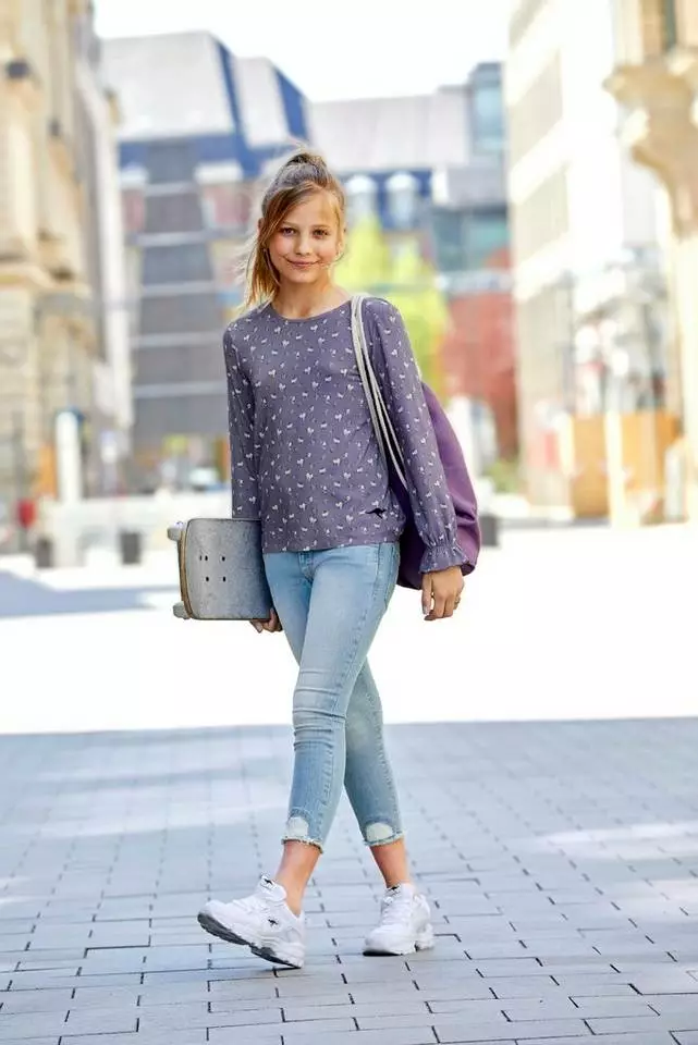 Mit einer Blue Jeans und leichten Canvasschuhen ergibt sich ein trendiger Look für Schule und Freizeit. Wenn das Outfit lässiger aussehen soll, kann zum Oberteil auch eine weite Hose mit einer Bomberjacke getragen werden.