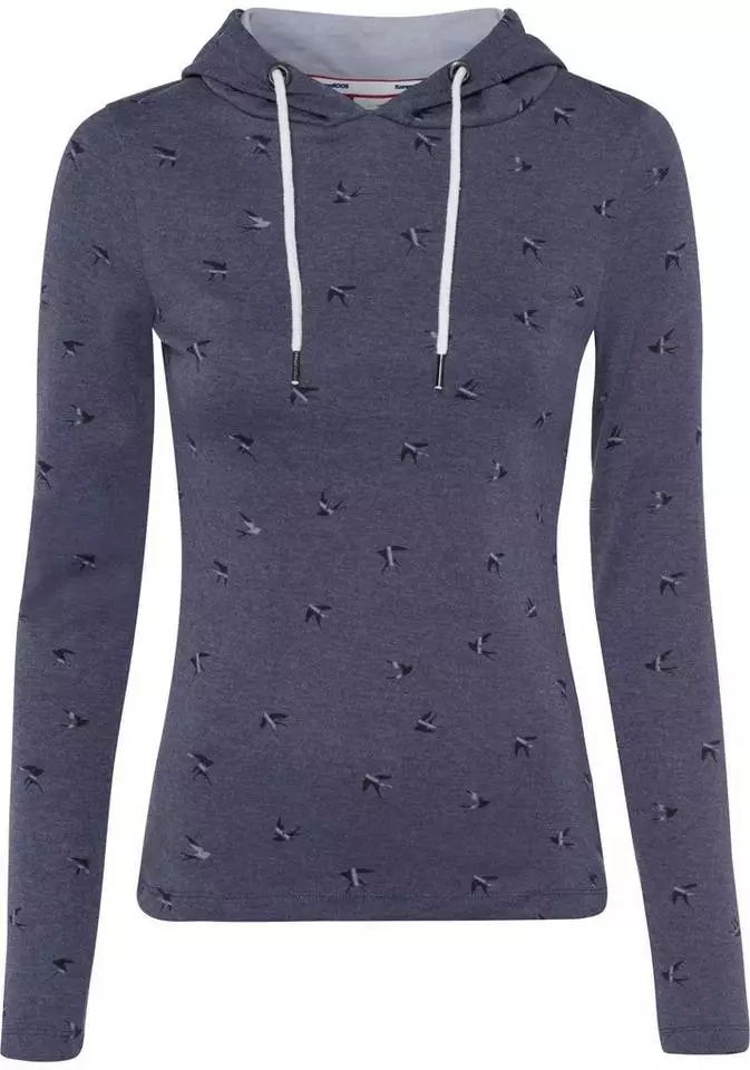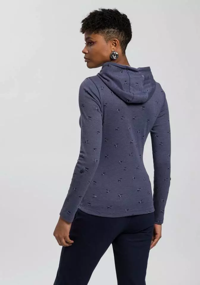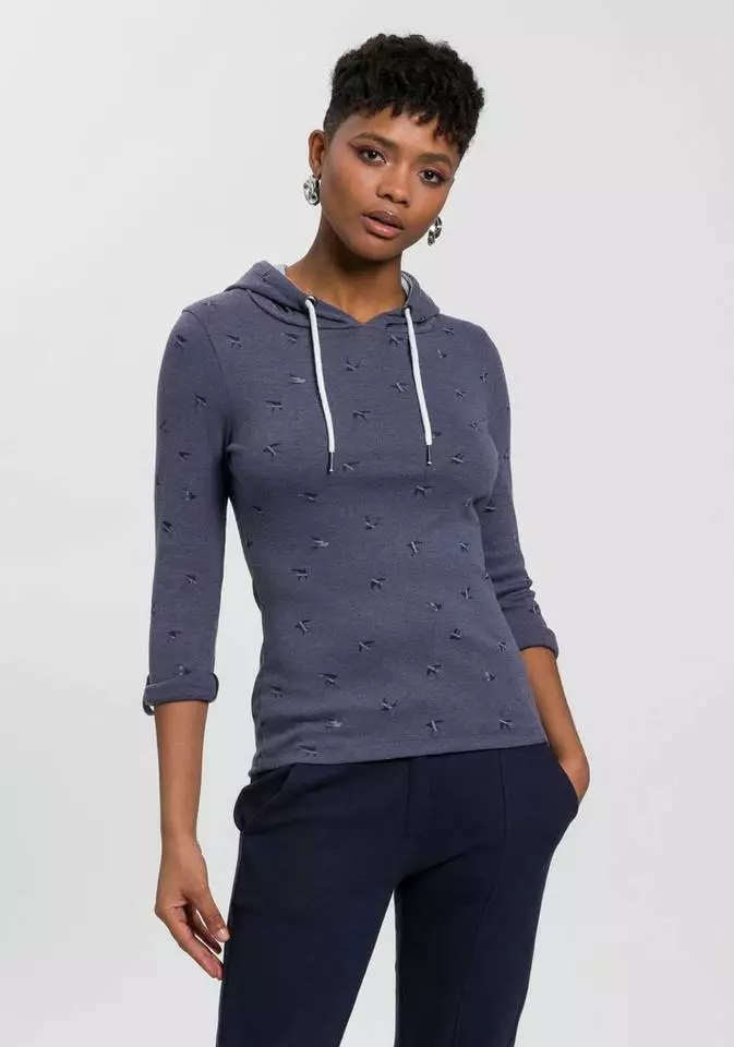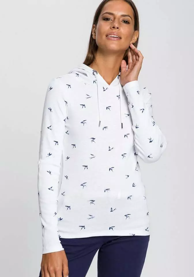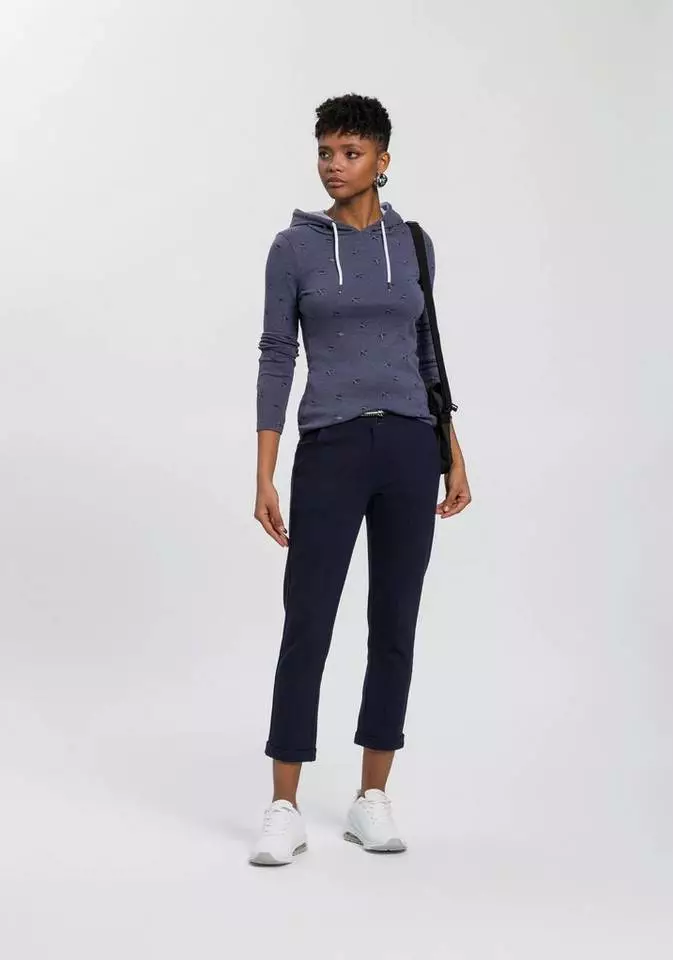 Das Langarmshirt von KangaROOS ist eine unkomplizierte Antwort auf die drängende Frage "Was ziehe ich bloß an?". Eine Kapuze ist bei diesem Langarmshirt angesetzt. Sie lässt sich mit einem Kordelzug in der Weite verstellen. Die langen Ärmel können leicht hochgekrempelt werden, wenn es zu warm wird oder du dir einen legeren Stil wünschst. Dieses Shirt ist hüftbedeckend sowie sehr figurbetont geschnittenLangarmshirt, sodass deine Silhouette schön betont wird.