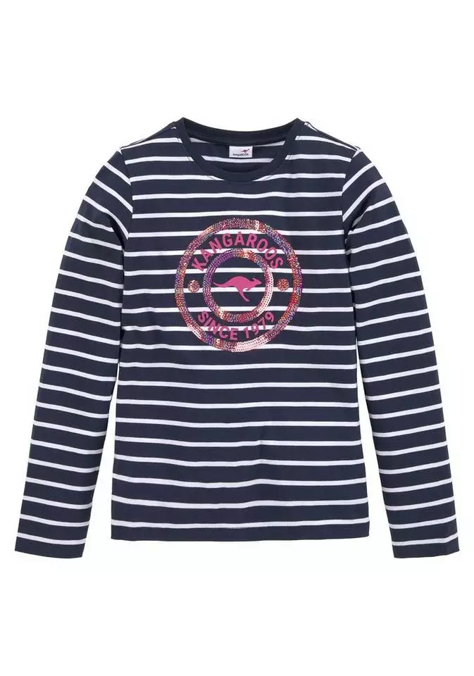 Ein süßer Liebling für Groß und Klein: Das gestreifte Langarmshirt von Kangaroos gefällt den Kleinen genau so gut wie den Großen. Das liegt dabei zum einen an dem großen Logoprint mit aufwendiger Paillettenapplikation vorn. Zum anderen kommt der Komfort der leicht taillierten Basicpassform und der elastischen Qualität richtig gut an. Ein unifarben eingefasster Rundhalsausschnitt macht Tragegefühl und Design komplett. Zu Leggings, Röcken oder Jeans macht das Ringelshirt eine tolle Figur. Das gestreifte Langarmshirt von Kangaroos – für glanzvolle Outfits ein Muss!