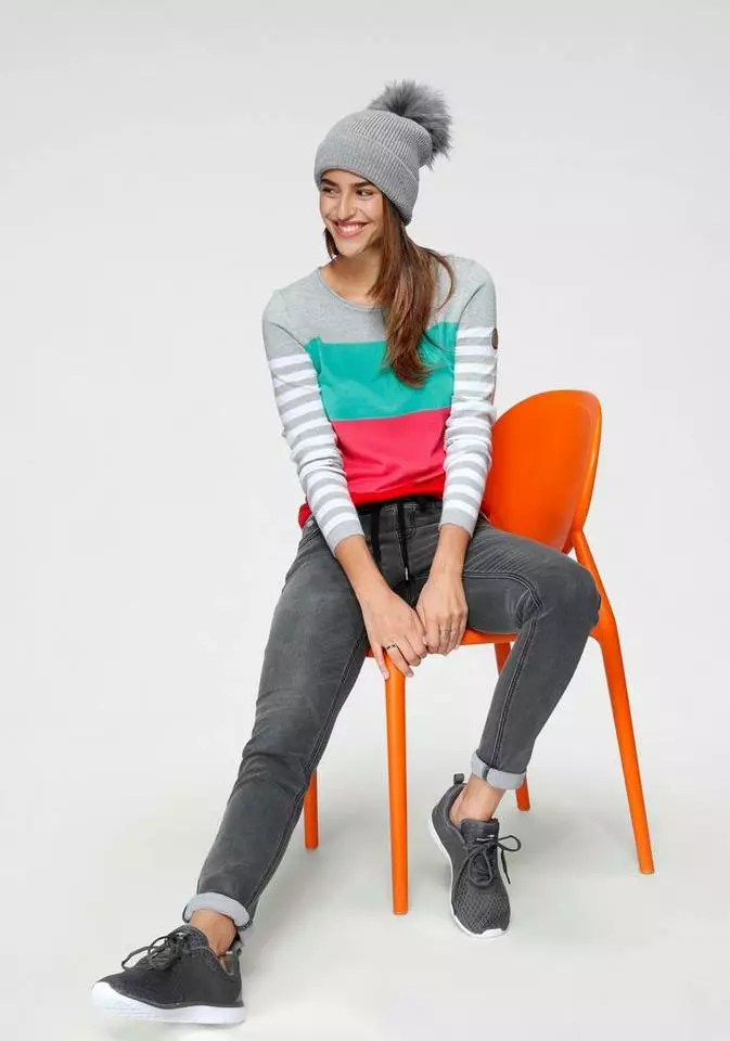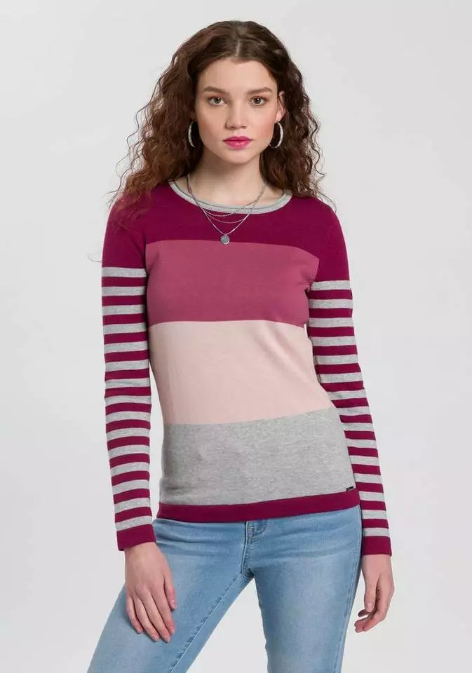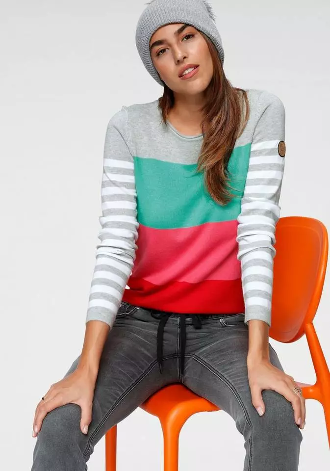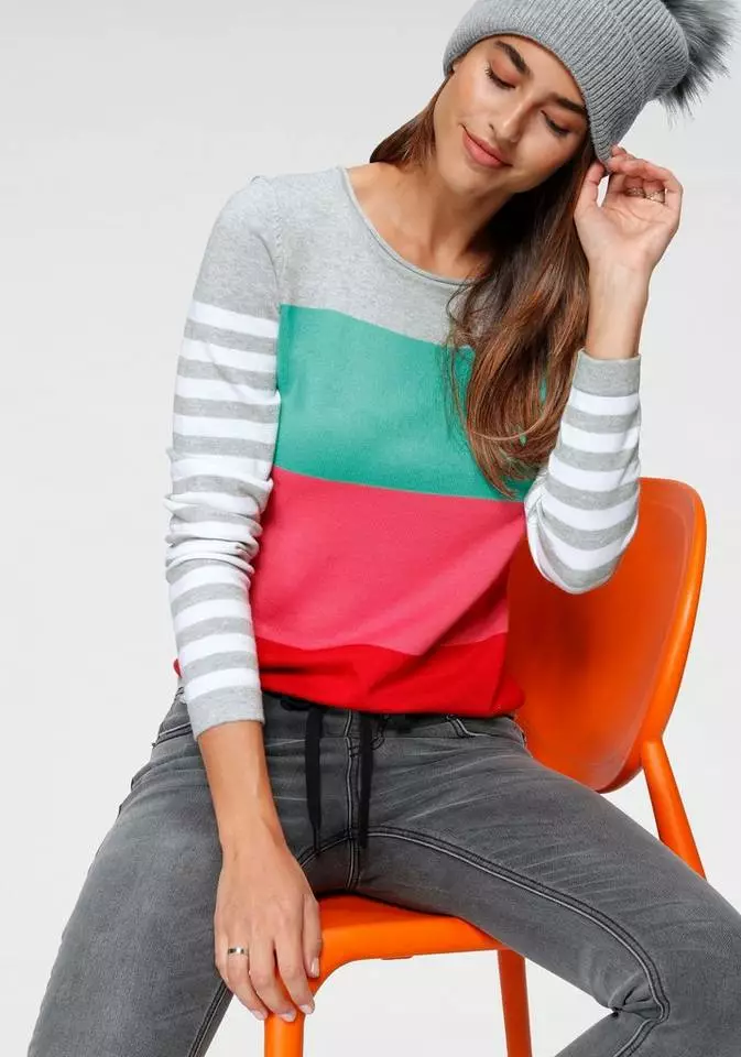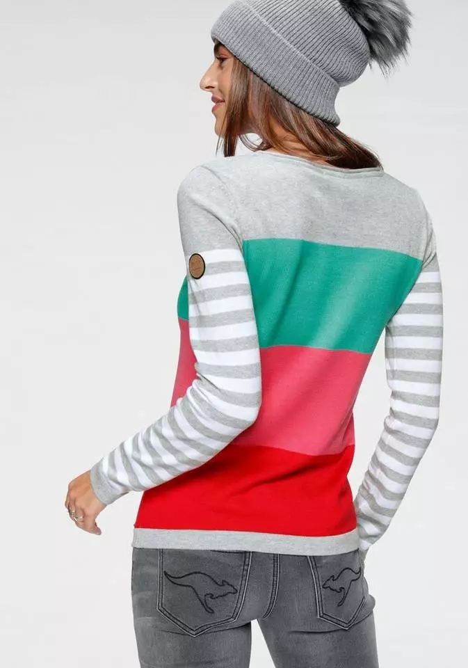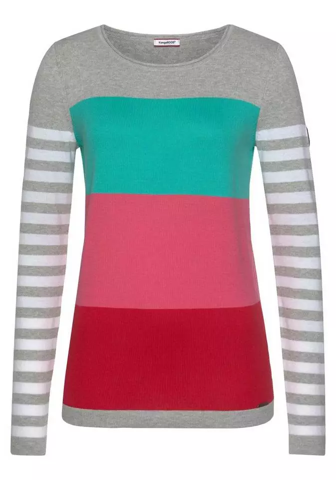 Musterfans aufgepasst! Der Feinstrickpullover von Kangaroos kombiniert selbstbewusst breite, mehrfarbige Blockstreifen im Oberkörper mit süßen Ringeln an den Ärmeln. Durch die lässige Rollkante am Rundhalsausschnitt und das kleine Label am Arm erhält das quirlige Langarmshirt einen weiteren Frischekick. Ob zu deiner lässigen Denim oder einem femininen Minirock, dem schlanken Streifenshirt stehen viele Looks. Das Feinstrickshirt von Kangaroos ist genauso vielseitig wie du.
