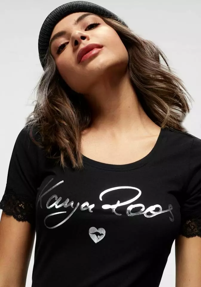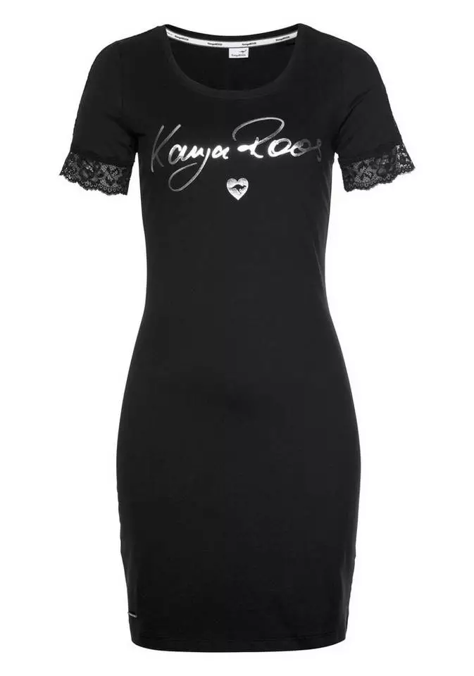 Frau sein von Kopf bis Fuß – mit dem Kleid von Kangaroos gelingt dir das wie von selbst. Die figurbetonte Form des Spitzenkleids hebt deine weiblichen Kurven hervor, während der weite Rundhalsausschnitt dir ein schönes Dekolleté zaubert. Dabei lenkt ein großer Logoschriftzug in glänzender Metallic-Optik den Blick. Einen reizvollen Abschluss bildet die tonige Spitze an den kurzen Ärmeln. Mit dem bequem elastischen Minikleid bekommst du wirklich alles geboten – ein tolles Design, gepaart mit viel Komfort. Genial kann so einfach sein: das Kleid von Kangaroos.