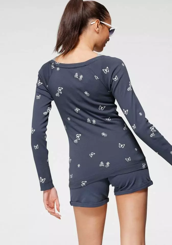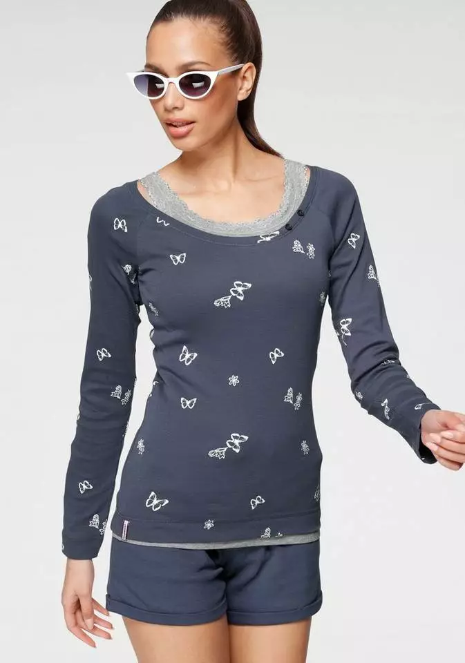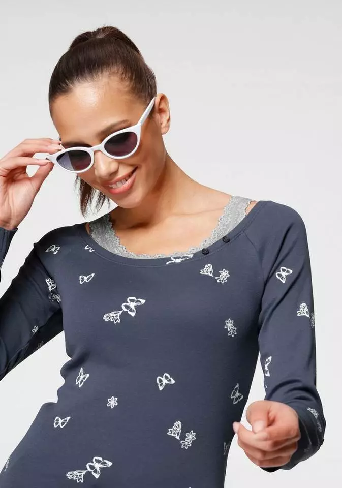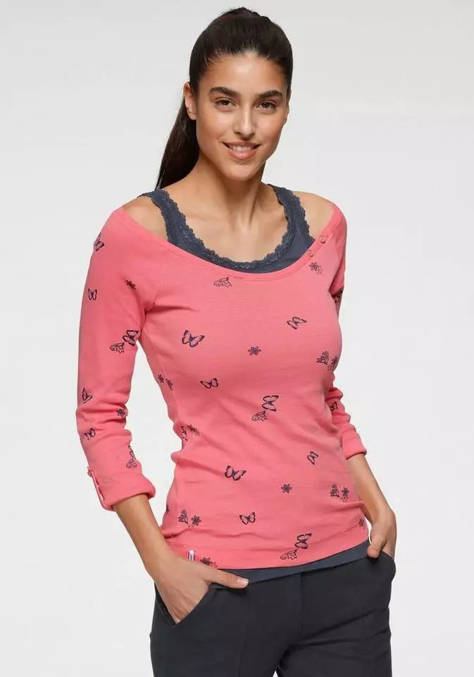 - Shirt mit Schmetterling-Allover-Druck + funktinonalen Turn-up Ärmeln, Top in uni mit süßer Spitze geschmückt