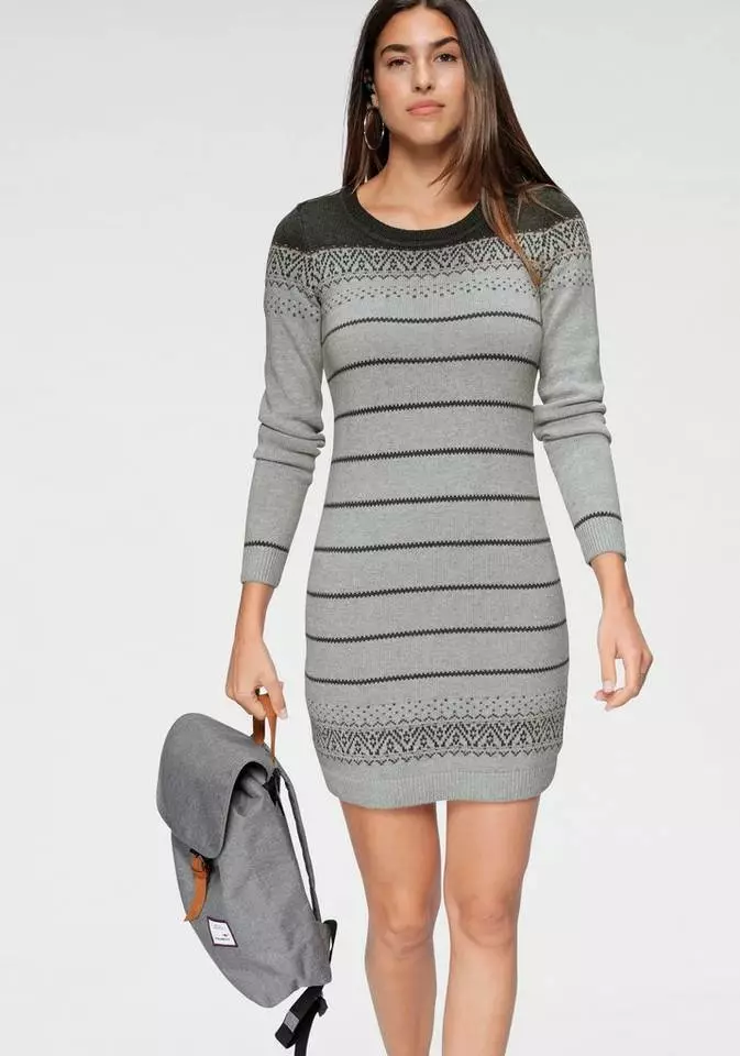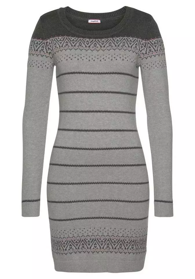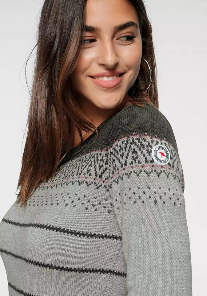 Ein wahres Highlight: das Strickkleid von Kangaroos im trendy Norweger-Style. Abwechslungsreich bezaubert das langärmelige Kleid mit einem Mix aus Norwegermuster und einem feinen Zickzackmuster. Als kontrastfarbener Colorblock fällt die Schulterpartie sofort ins Auge. Der figurbetonte Schnitt des Damenkleides schmeichelt der Silhouette. Ein hübscher Rundhalsausschnitt ergänzt den durch und durch femininen Look des Kleides. Der hochwertige Feinstrick trägt sich leicht und angenehm auf der Haut. Kombiniert mit blickdichter Strumpfhose und kniehohen Stiefeln, kreiert man ein lässiges, modisches Outfit. Gerade an kühleren Tagen braucht man ein Strickkleid wie das von Kangaroos!