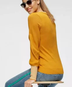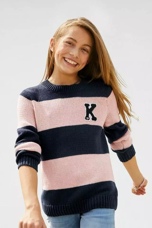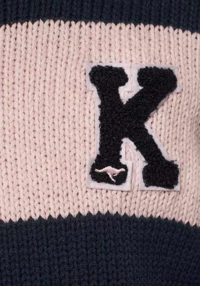 Der Strickpullover von Kangaroos versprüht coolen College-Flair. Dafür sorgen die kontrastierenden Blockstreifen und das applizierte Logobadge auf der Brust des Mädchenpullis. Die Bündchen und der Rundhalsausschnitt sind im breiten Rippstrick gearbeitet für den perfekten Sitz des weichen Pullovers. Die gerade Basicform trägt sich besonders bequem, noch gemütlicher wird`s in Kombination mit Leggings und Sneakers. Ein Liebling für jeden Tag: der Strickpullover von Kangaroos.
