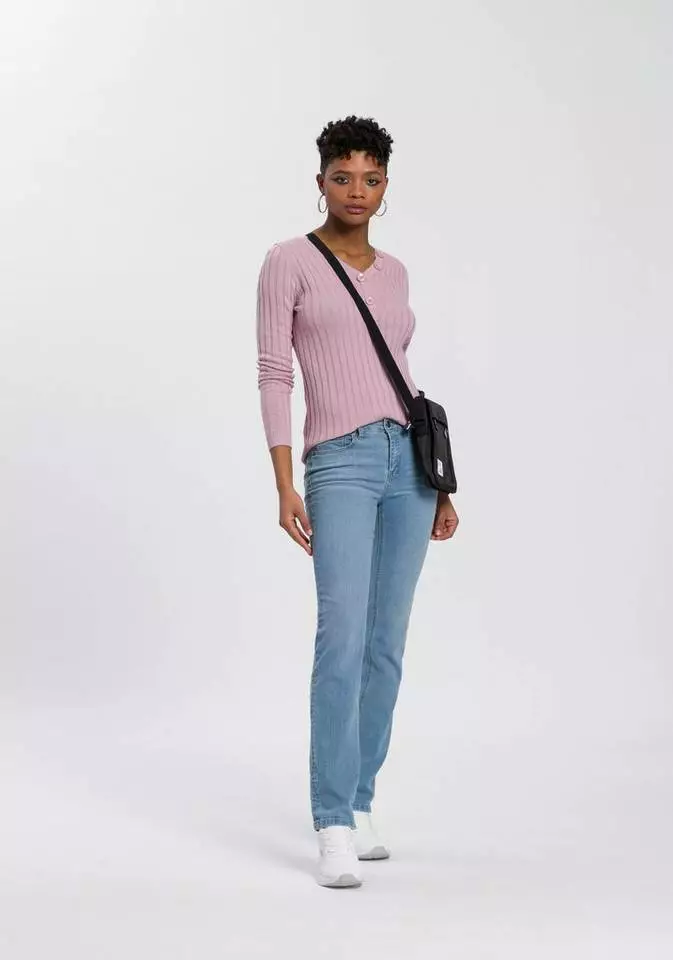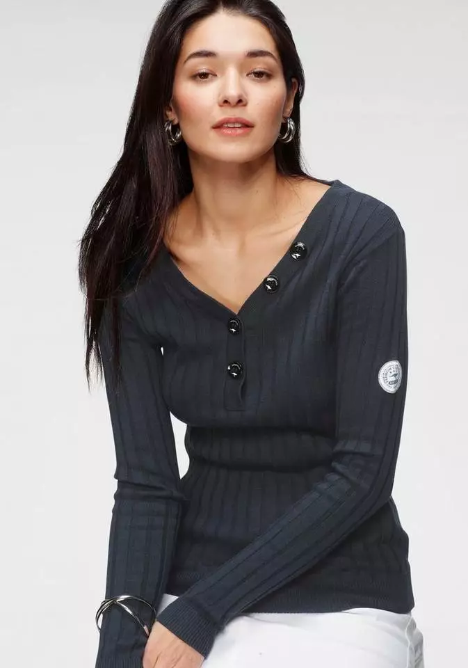 Von wegen der Henleyausschnitt ist nur was für die Männerwelt. Der Pullover von Kangaroos macht die elegante Ausschnittvariante in femininer Machart auf. Dazu bedient sich der taillierte Pulli der klassischen V-Form und erweitert diese um glänzende Knöpfe. Durch die Rippenstruktur und die bequemen Bündchen an den Säumen sitzt der Feinstrickpulli richtig bequem und passt sich deiner Körperform optimal an. Mit Jeans und Sneakers liegst du schon richtig. Elegant wird es mit einem Bleistiftrock und Pumps. Toller Stylehybrid: der Pullover von Kangaroos.