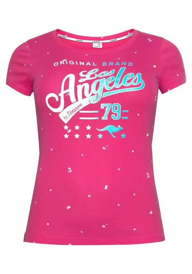 Auf so ein T-Shirt wie hier von Kangaroos kannst du dich in Sachen Styling immer verlassen. Das Design mit Rundhalsausschnitt und kurzen Ärmeln ist klassisch und lässt sich in alle erdenklichen Richtungen kombinieren. Weil ein Basic-Shirt aber nicht unbedingt immer unifarben und zurückhaltend sein muss, ist dieses Printshirt mit einem Allovermuster und einem auffälligen Schriftzug vorn bedruckt. So kannst du das Basic auch mal zum Highlight eines Outfits machen. Geht nicht gibt`s nicht – mit dem Shirt von Kangaroos ist alles möglich.