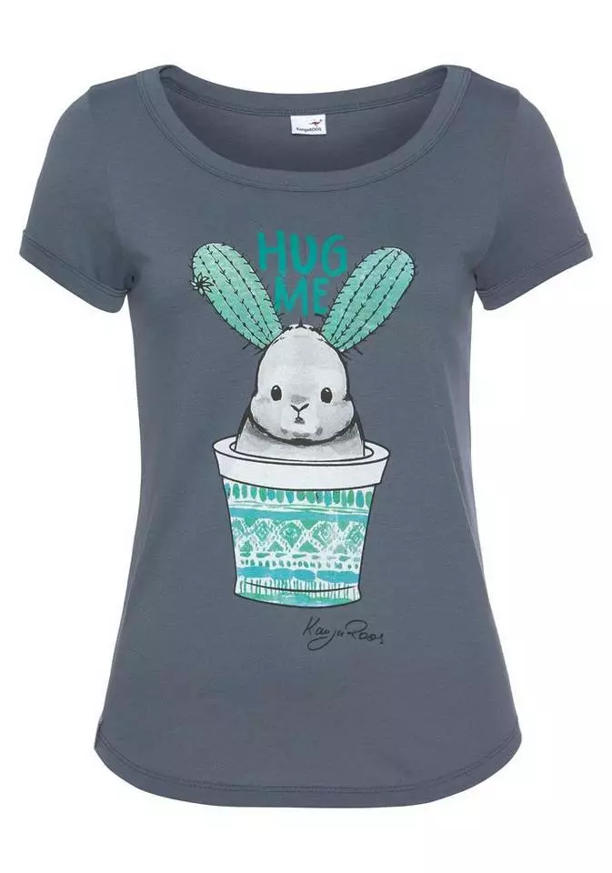 Ein Print zum Verlieben. Bei dem niedlichen Motivdruck auf der Vorderseite wird man im Handumdrehen schwach. Das schöne Detail wird bei dem Kurzarmshirt von Kangaroos stimmig mit femininen Elementen abgerundet. So ist der Rundhalsausschnitt extra weit und lässig geschnitten, die Silhouette umspielt mit der leichten Taillierung deine Figur und die Säume sind dezent abgerundet. Richtig authentisch wirkt das Printshirt im klassischen Casual-Look zu deiner Bluejeans und Freizeitschuhen. So süß: das Kurzarmshirt von Kangaroos.