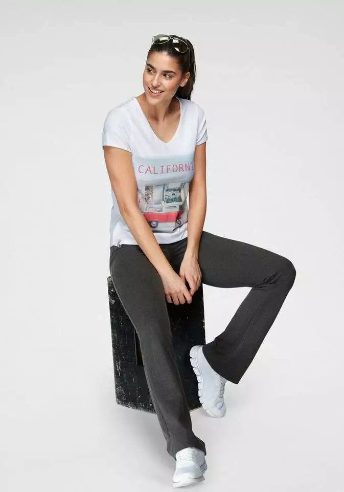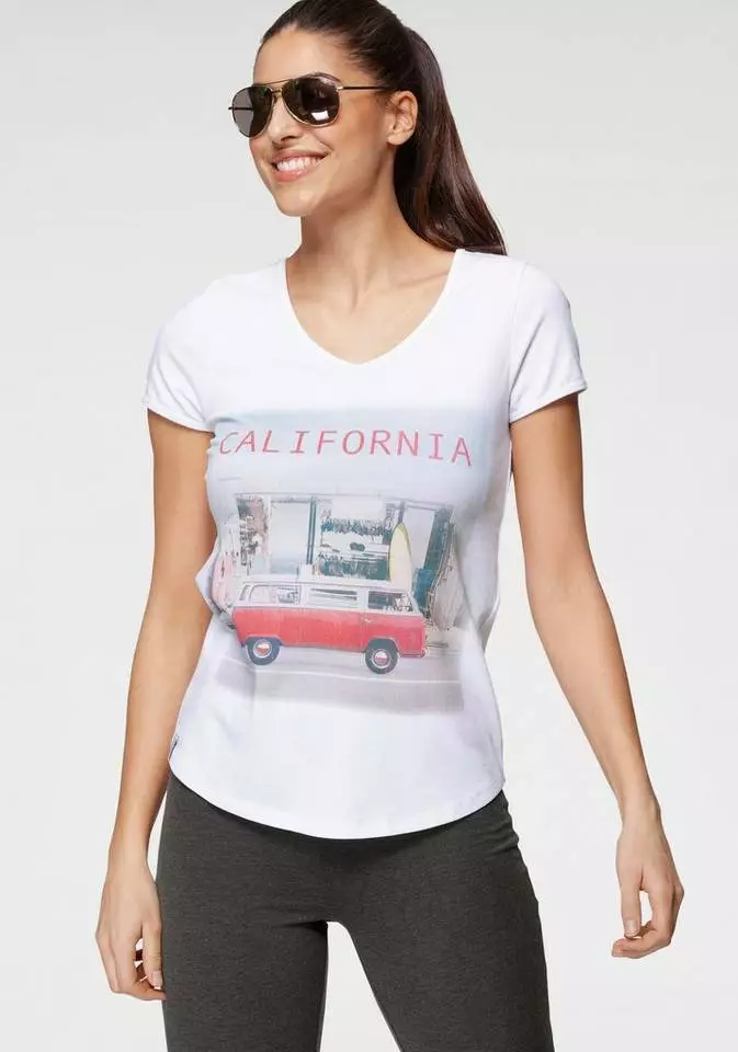 Cooler Print in XXL-Optik. Der Clou an dem T-Shirt von Kangaroos ist zweifelsohne das große farbenfrohe Druckmotiv auf der Vorderseite. Es macht aus dem Basicshirt mit dem V-Ausschnitt im Nu ein trendiges Printshirt. Ob eingesteckt oder offen getragen, die Kombinationsmöglichkeiten für das weiche Baumwollshirt sind schier endlos. Unser Tipp: Der taillierte Schnitt des Shirts ist wie gemacht für feminine Looks, zum Beispiel mit einem Minirock oder Denimshorts. Lass deinen Stylingideen freien Lauf, mit dem T-Shirt von Kangaroos.