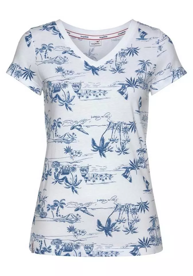 Surfer Girls aufgepasst: Das T-Shirt von Kangaroos mit seinem coolen Alloverprint ist genau der richtige Buddy für deinen nächsten Strandurlaub. Ein sportlicher V-Ausschnitt begleitet den lässigen Druck des Jerseyshirts aus einer angenehm weichen Baumwolle-Modal-Mischung. Das sommerliche Printshirt fühlt sich besonders wohl in entspannten Outfits mit Bermudas oder Chinohosen und Freizeitschuhen. Am liebsten unkompliziert: das T-Shirt von Kangaroos.